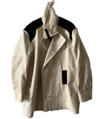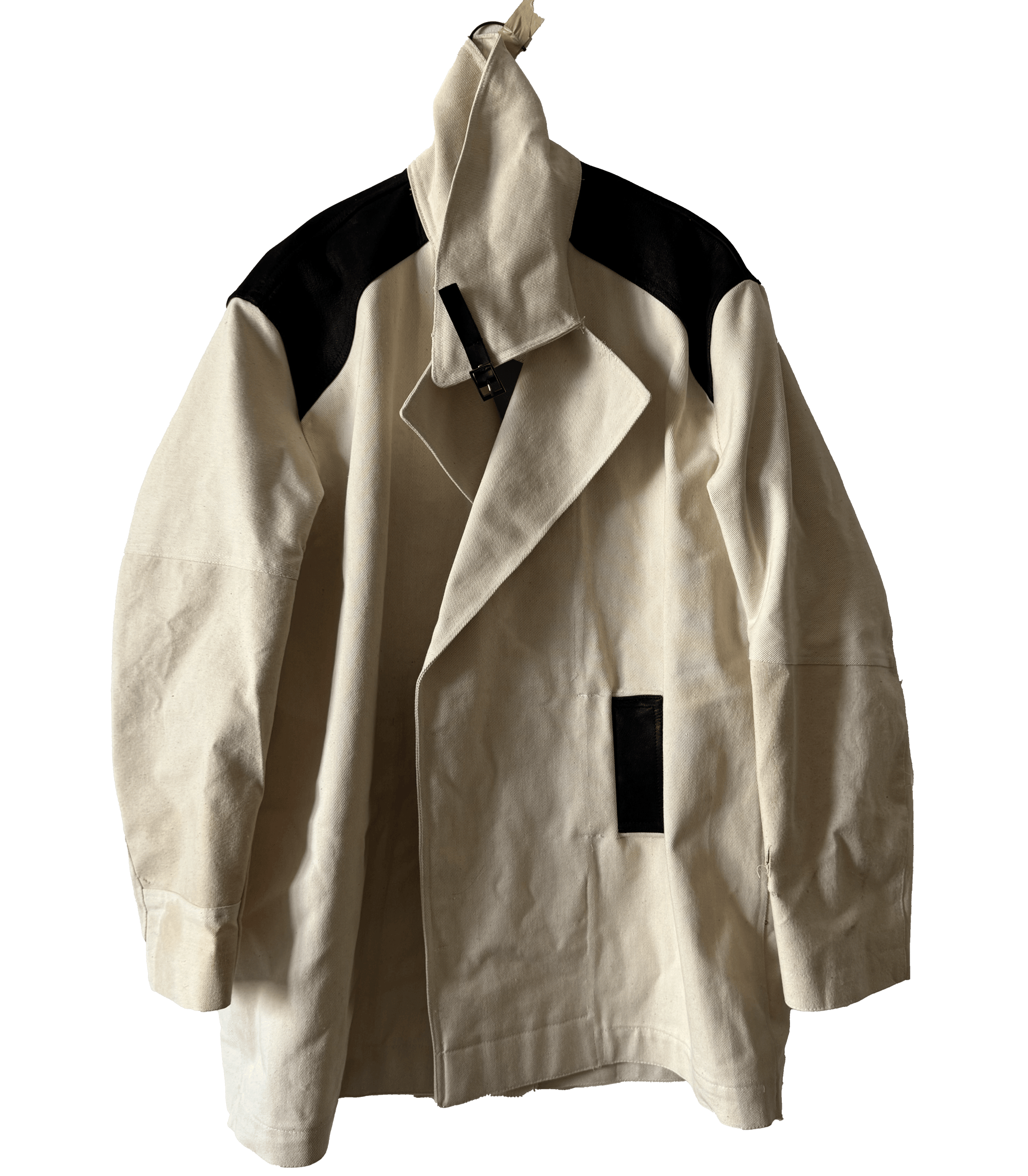 OVERSIZED WORK COAT CRAFTED FROM 100% HEAVYWEIGHT COTTON DUCT CANVAS SOURCED FROM IRONING BOARDS, PAIRED WITH HAND-WAXED COW LEATHER. FEATURES A BUCKLE CLOSURE AT THE COLLAR AND AN ADJUSTABLE LEATHER HARNESS BACK, CREATING A STRUCTURED YET RELAXED SILHOUETTE. ONE-OF-A-KIND, ONE-SIZE (OS). LOST HIGHWAY COLLECTION.