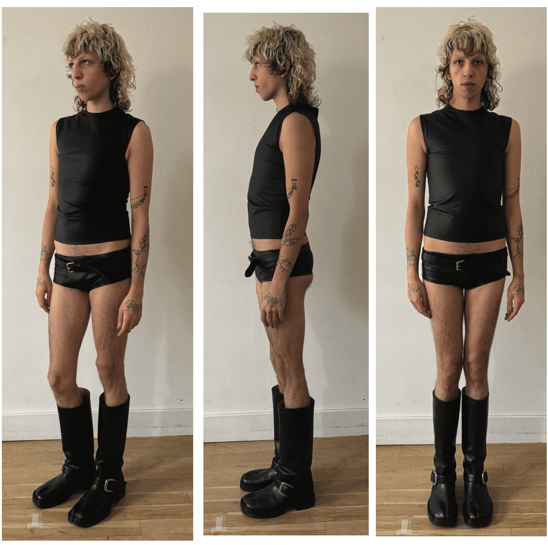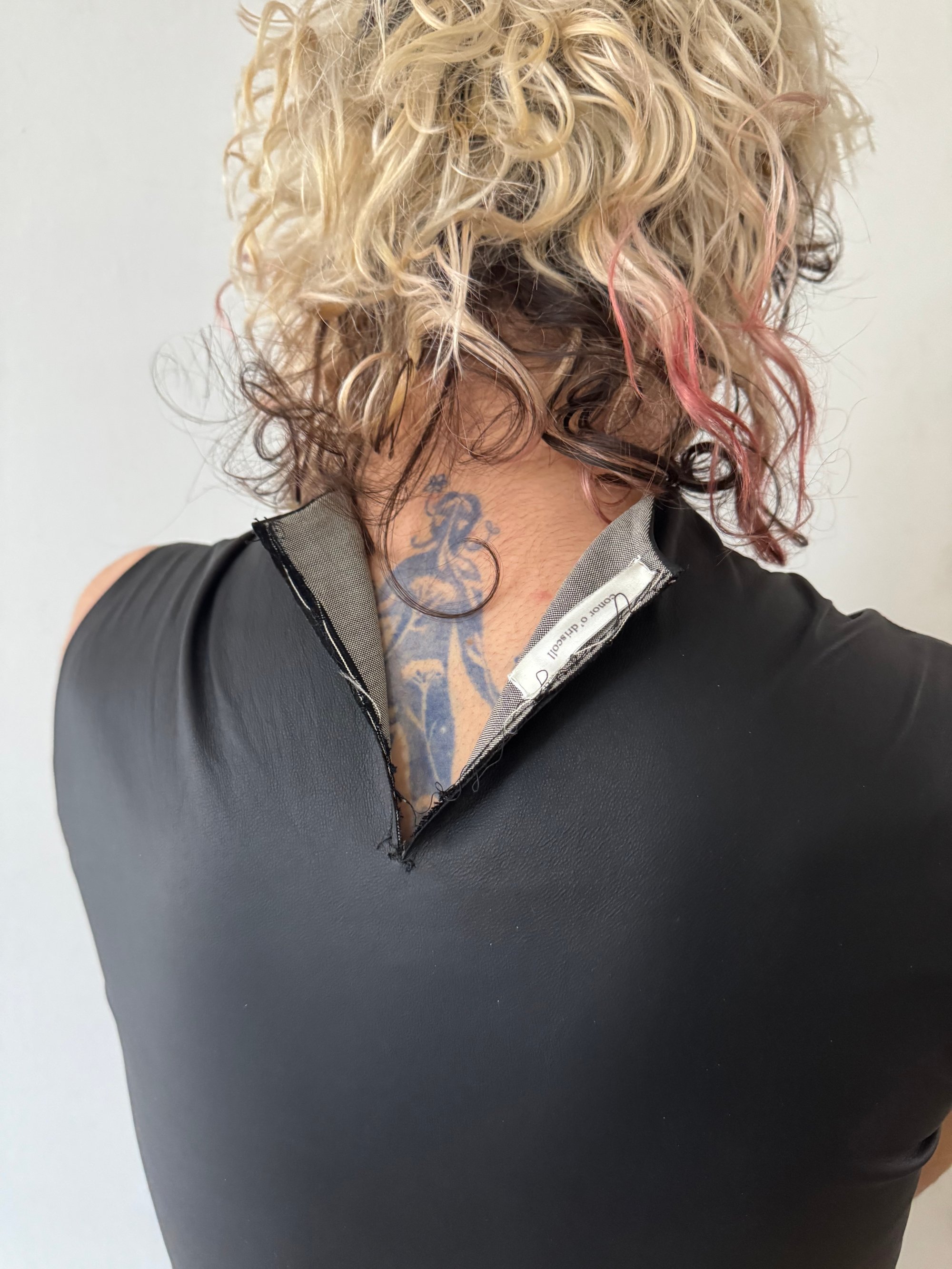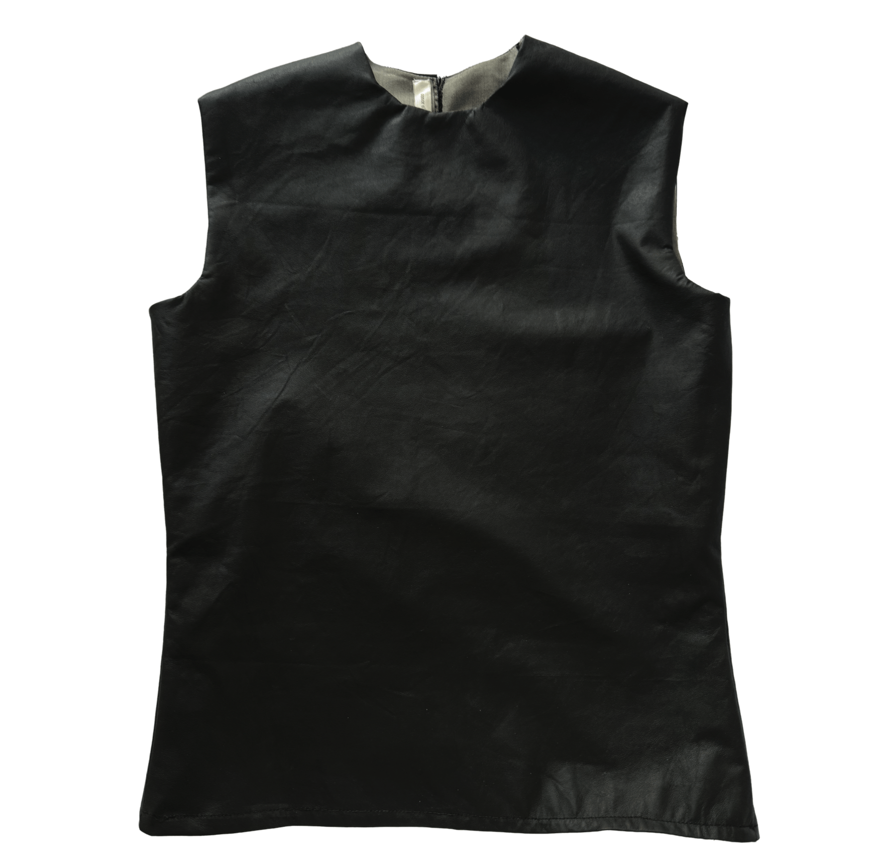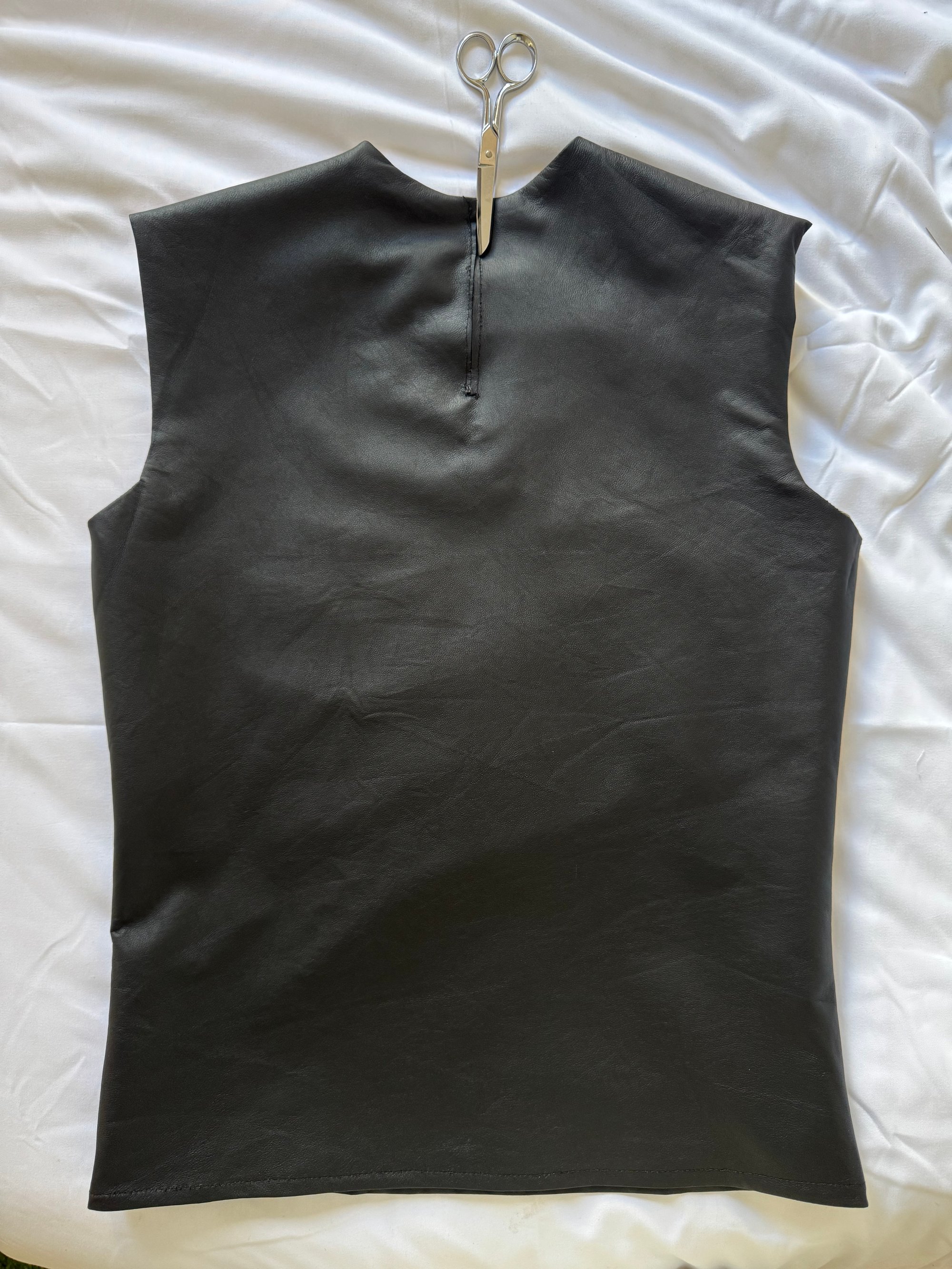 PAPER-THIN LEATHER TOP DEVELOPED WITH A CENTER BACK SLIT, ENGINEERED TO BE ACTIVATED BY THE WEARER. PRIOR TO WEAR, A SINGLE SECURING THREAD AT THE TOP OF THE SLIT IS CUT, RELEASING THE FOLDS AND ALLOWING THE BACK PANELS TO OPEN IN MOTION. WHEN WORN, THE FLAPS SEPARATE TO REVEAL A MOHAIR LINING AND SILK TAG DETAIL, EMPHASIZING TRANSFORMATION, HAND, AND INTENTIONAL INTERACTION WITH THE GARMENT. DEVELOPED WITH A TIGHT, BODY-CONSCIOUS FIT AND A NEUTRALLY UNISEX BASE PATTERN, FITTED ON BOTH MALE AND FEMALE FORMS. MODEL WEARS A (S).